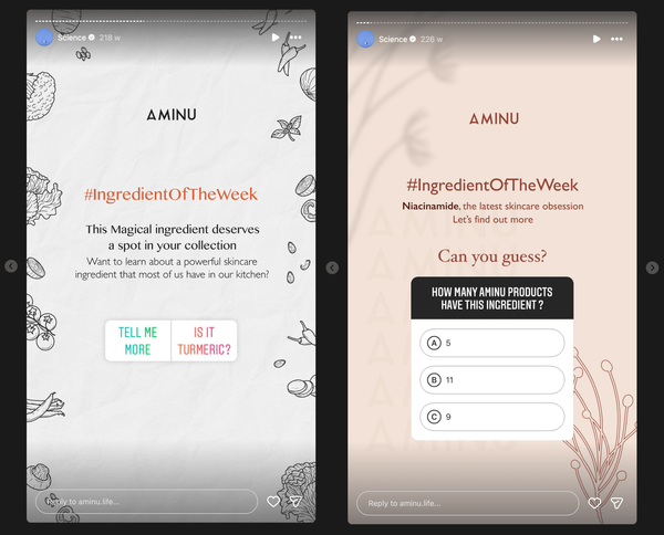 For example, skincare brand Aminu Life, used to run an #IngredientOfTheWeek Instagram Stories series where they educated customers about the various ingredients in their products. They later added these stories to their Instagram Highlights so anyone visiting their profile can access them.