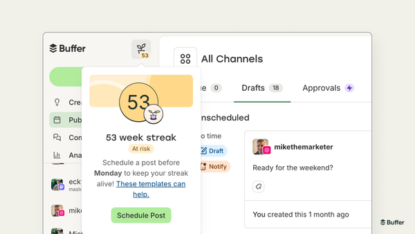 Alongside that, we launched Posting Goals, weekly targets you can set per channel. And Share Your Streak lets you generate a post celebrating your streak count, complete with some nice visuals.