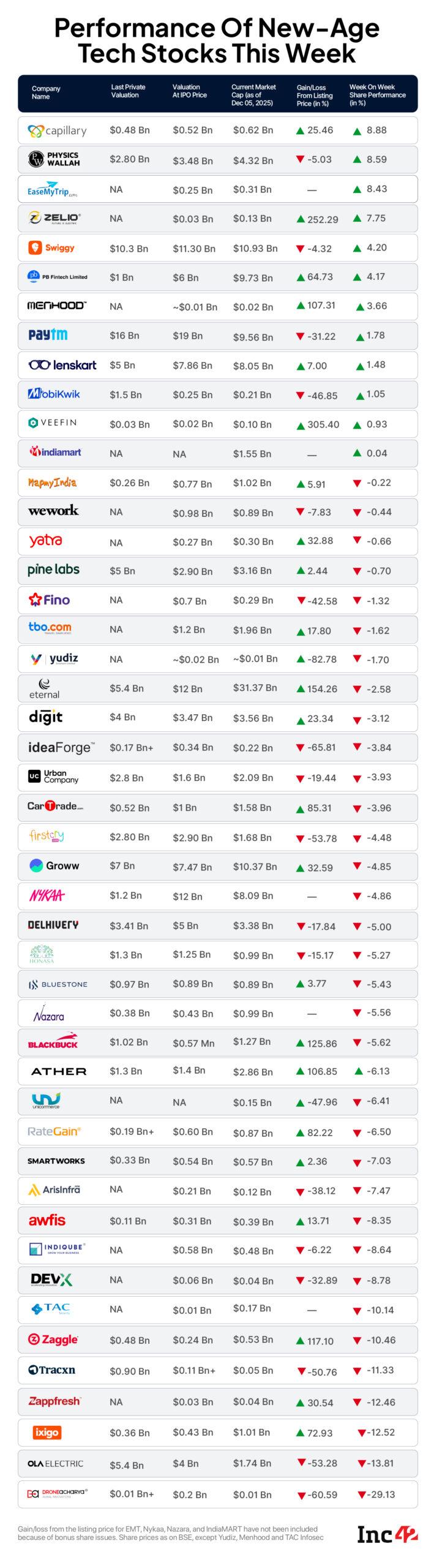 PhysicsWallah was the second biggest gainer this week, with its shares gaining 8.59% to close at INR 135.9. The company is scheduled to release its Q2 FY26 financial statements on December 8 (Monday).
